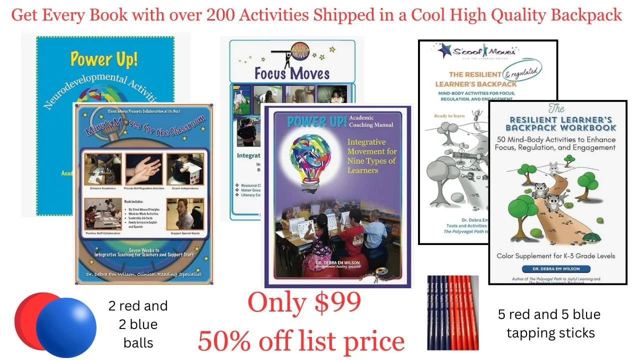 Three of the books are full color with a wide variety of activities to help regulate, improve focus, and enhance academic skills. These books are filled with engaging activities and information bringing together 25 years of S’cool Moves workshops into one complete bundle. You can copy activities for your students, share them with document cameras, and send them home over the summer. You’ll never run out of activities when you have these books at the ready. The bundle is shipped in a quality backpack to carry with you wherever you go!