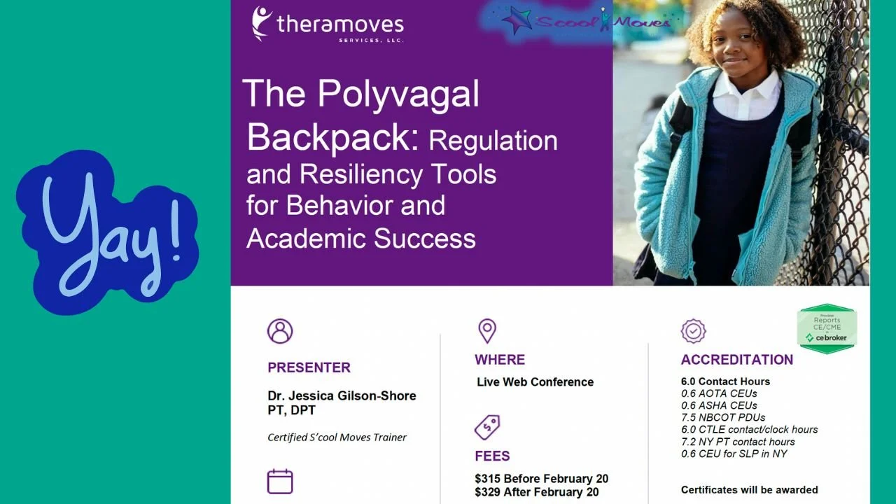These are the only S’cool Moves courses available that are approved by designated organizations like AOTA, ASHA, PT, NBCOT, CTLE, NY Clock Hours.