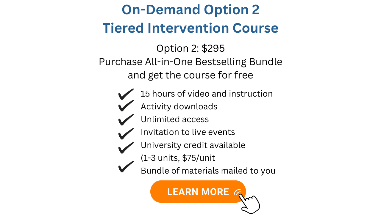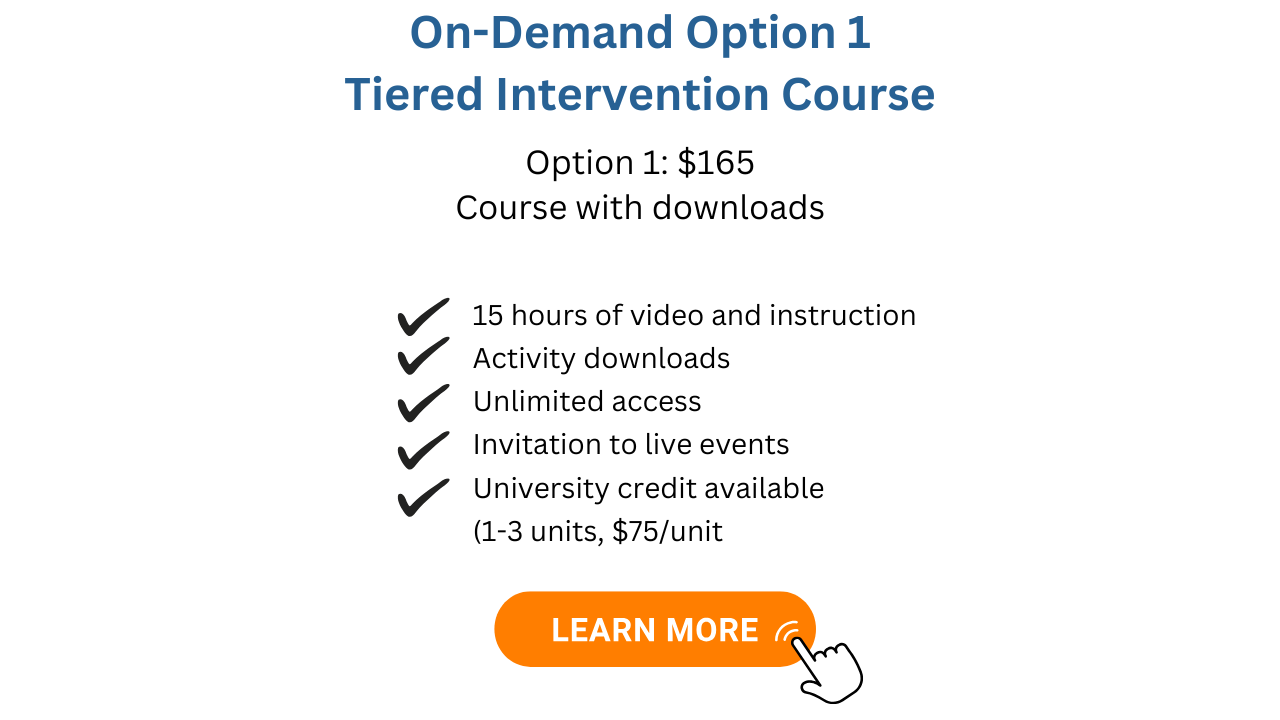 The Tiered Intervention Course is best for teachers and support staff working in schools using a tiered intervention framework (RTI or MTSS) as the content is presented within tiers 1, 2, and 3.